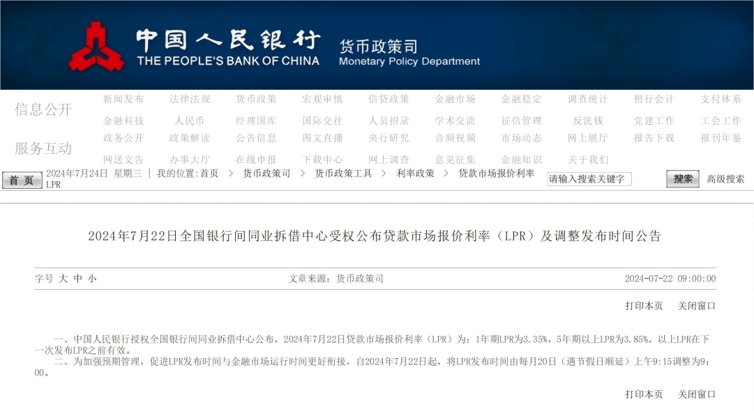 为加强预期管理,促进LPR发布时间与金融市场运行时间更好衔接,自2024年7月22日起,将LPR发布时间由每月20日(遇节假日顺延)上午9:15调整为9:00。